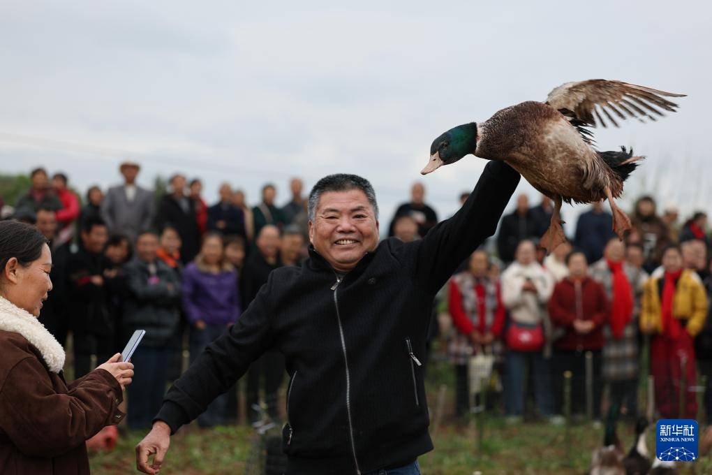 3月14日,一名游客在猎鸭体验中炫耀自己的“奖杯”。 3月14日,“红土春”田园节在四川省容县乐德镇天宫寺村举行。当地村民组织了有趣的农耕体验、农产品展览、数百场家庭宴会,吸引了众多游客前来体验。图片提供:新华社记者姜红景。