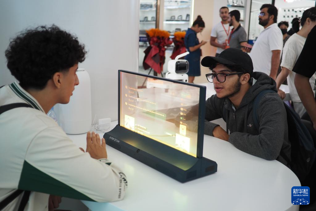 10月14日,两名外商在义乌全球数字贸易中心体验人工智能翻译互动屏。 10月14日,浙江省义乌市第六代市场全球数字商务中心开始运营,开启义乌市从传统贸易模式向数字贸易生态的新进程。作为第六代市场的标志性项目,义乌全球数字贸易中心实施了新型数字基础设施,包括10G光网络和跨境数据传输通道。建筑面积125万平方米,分为商场大厅、办公楼、商业街区、公寓、数字商港五个主要功能部门。其中,集市版块拥有商户3700余家,覆盖发展时尚饰品、创意玩具、智能设备等八个新兴产业。新华社记者 刘子仪 供图