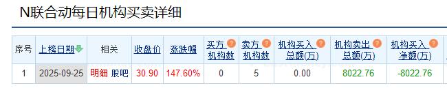 中国经济网络北京,9月25日,联合力量(301656)今天关闭30.90元,为147.60%。根据五五个主要销售部队的龙和老虎名单上的数据,所有这些都是该机构的专用席位。根据统计数据,当今机构席位的联合电力净销售额为802.276亿元人民币。